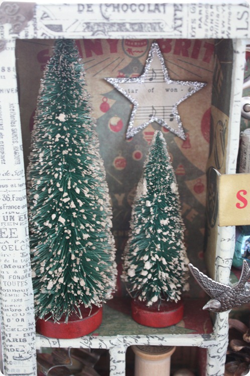 I followed a lot of the ideas that Tim showed in his videos here. The timing couldn’t have been better for his videos because I just happened to have everything that I needed already on hand. The trees were from a different antique shop that we visited the same weekend. The outer shell and the inside of the boxes is covered with tissue tape. Inside the boxes is Christmas paper from his holiday papers. I glued down the papers with Golden Gel Medium. It was super fast and easy.